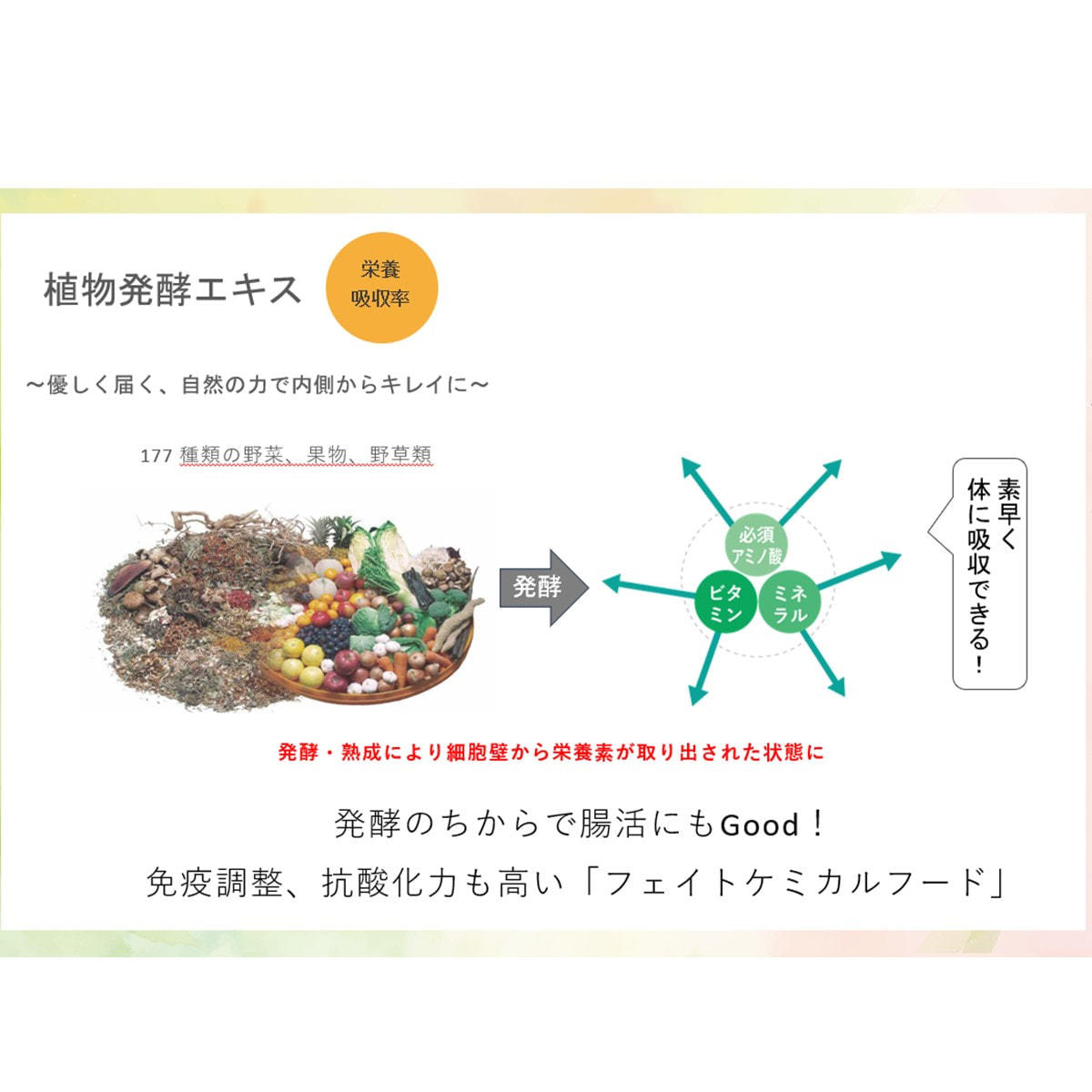植物発酵エキス、スマート乳酸菌、グリーンキウイ由来酵素、水溶性イオン化ケイ素、コエンザイムQ10