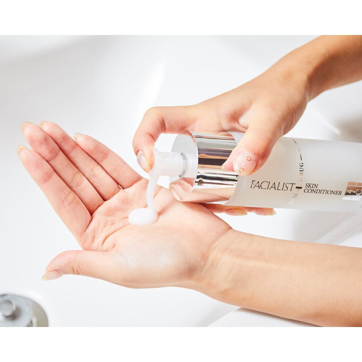②~③を肌が手のひらに吸いつき、しっとりするまで繰り返します。