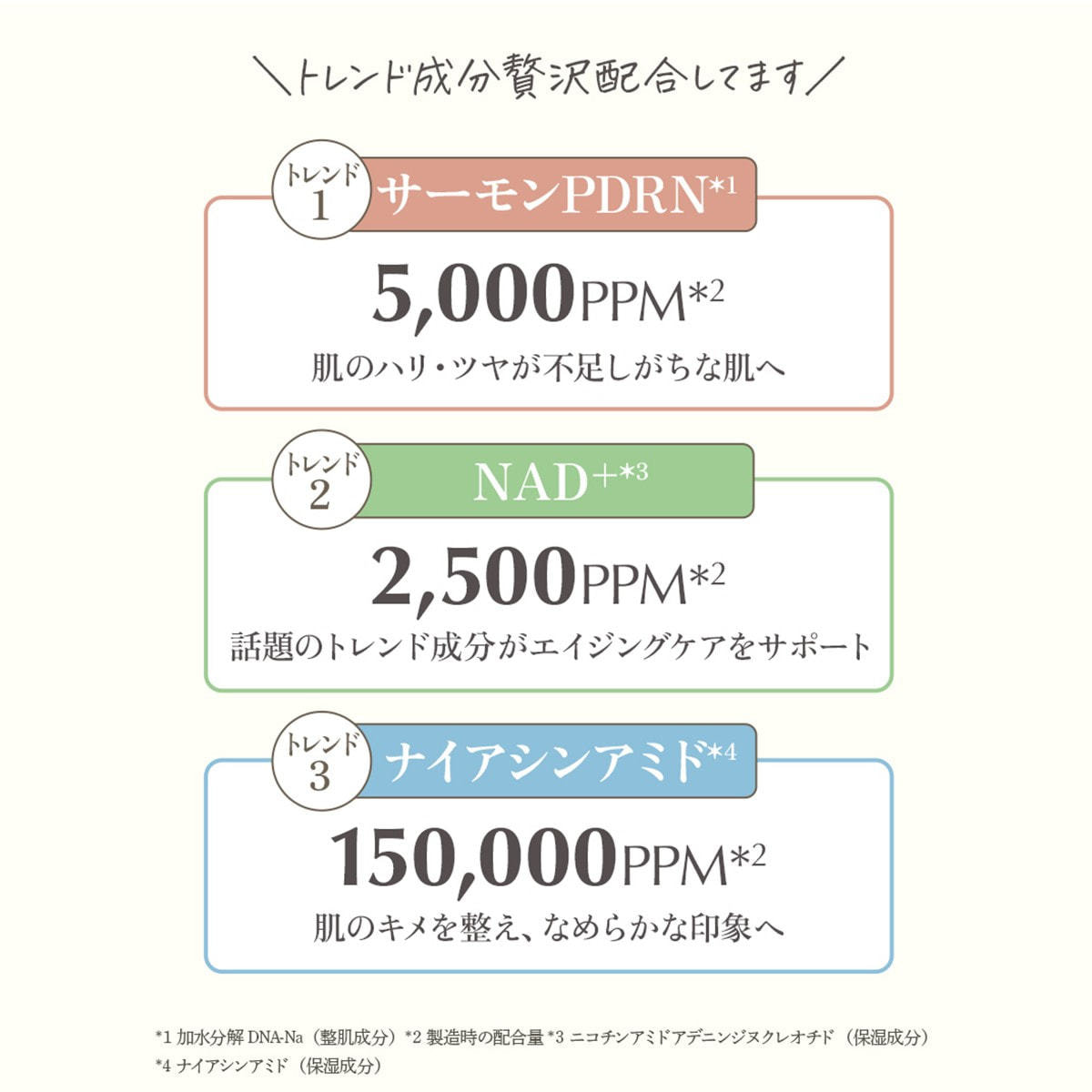 トレンドのサーモンPDRN(※2)とNAD+(※3)を配合し、肌ダメージ(※4)を集中ケア。