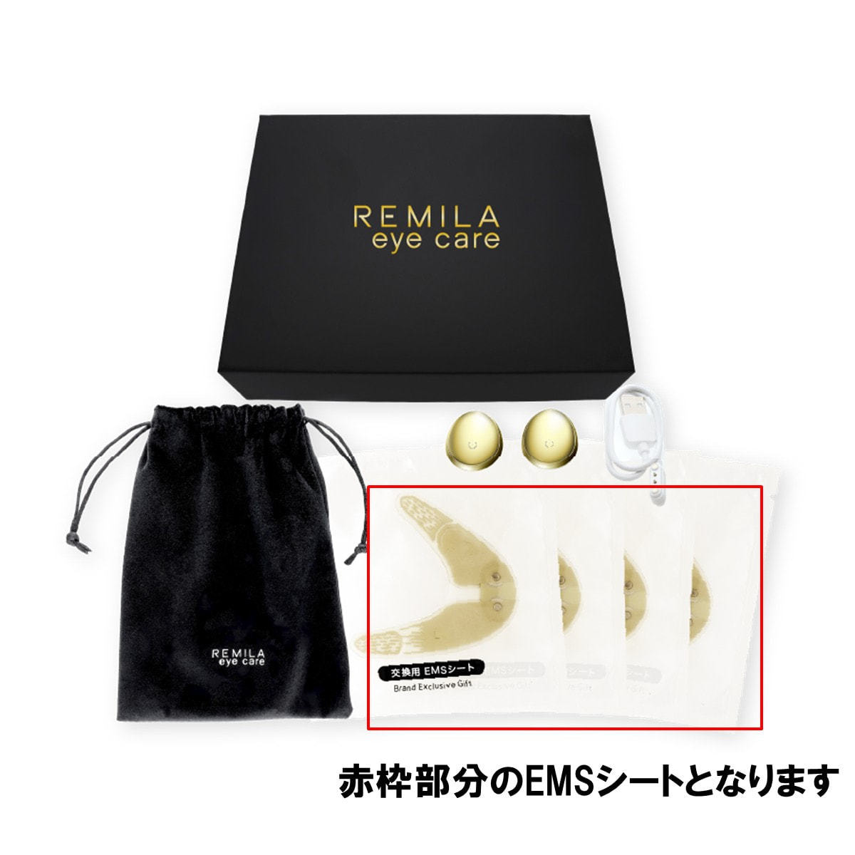 REMILA eye care(レミラ アイケア)専用のEMSシートです。 左右1枚ずつのシートが1包に入っており、4包セットでのお届けとなります。